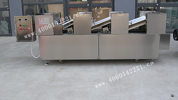 生产流程:1.和面 2.醒发 3.压面 4.筛粉 5.油炸 6.熬糖三台 7 .喷糖+搅拌 8.提升机 9.成型切割机 9.理料包装机